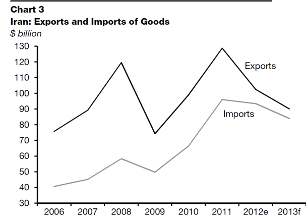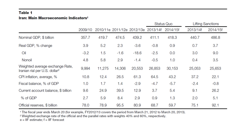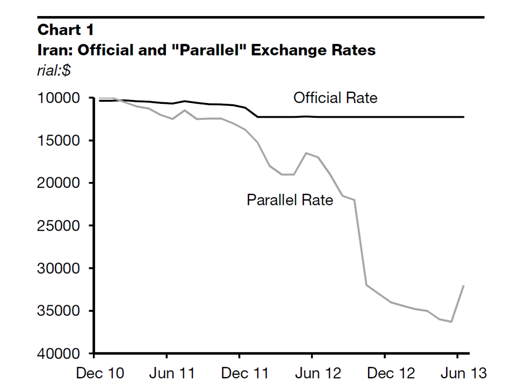 “The new sanctions penalize holders of a ‘significant’ amount of rials outside the country,” states the IIF. “These measures could lead to further depreciation of the parallel market rate. If the next government makes no concessions in the coming months, the economic situation is likely to worsen further in FY2013/14.