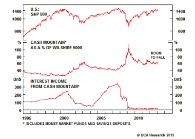 According to our US Equity Strategy service, it would be surprising for equities to peak before the cash mountain has at least declined to the level seen at the 2007 top in share prices, especially since the interest earned is even lower now.