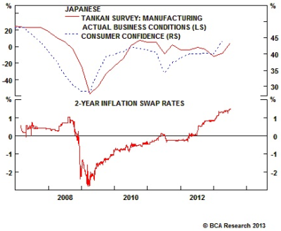 Although many have cast doubts over Shinzo Abe’s reform plan, there are emerging signs that aggressive monetary reflation is having a positive impact on the Japanese economy. Money and loan growth has reaccelerated, consumer confidence has risen and the Tankan business survey has also spiked. Most importantly, financial markets seem to believe that the authorities will achieve their inflation target. For the first time in many years, inflation expectations in Japan have risen above 1%. In short, the Bank of Japan (BoJ) so far appears able to manage a revival in consumer and business confidence via a combination of large-scale QE program and a sharp yen devaluation. We see no reason why these positive trends will come to an abrupt end, so long as the BoJ maintains its policy (the BoJ meets later this week – stay tuned).