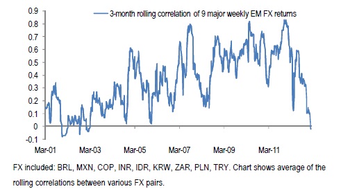 As the major tail-risks to the global economy and financial system – a eurozone break-up, hard landing in China and a recession in the US – have diminished, so the correlation among EM currencies has decreased.
