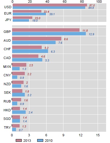 The US dollar remained unchallenged as the dominant currency on the world’s FX market, appearing on one side of 87% of all trades in April 2013, up from 84.9% in 2010.