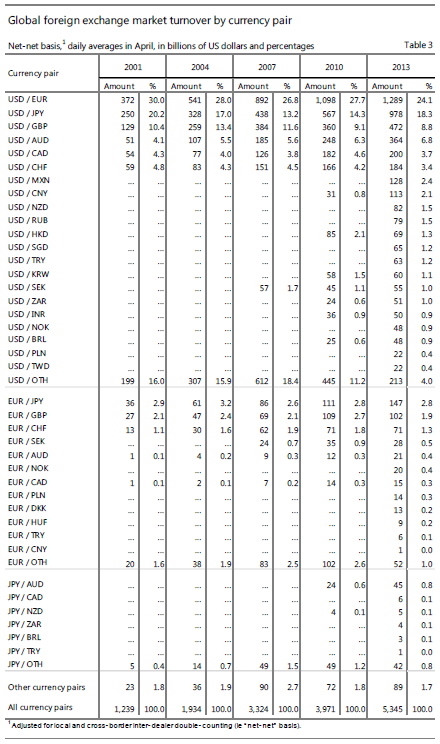 However, the rise of RMB has been meteoric, coming virtually out of nowhere in 2007 – when it was ranked 20th, accounting for just 0.5% of global turnover – to become the currency with the ninth-highest turnover, with 2.2% of the global market. By currency pair it’s a similar story: USD/CNY turnover has surged 265% and now accounts for 2.1% of all trades in which USD is on one side.