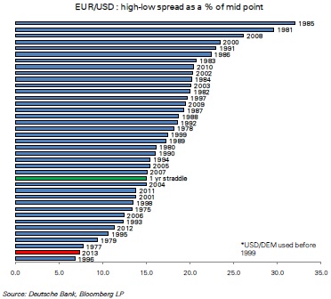 Take the current one-year straddle breakeven for EURUSD, which implies a range of 18 big figures – from $1.2620 to $1.4440. It is 190% of this year’s range, which is heading towards being the second narrowest since the collapse of the Bretton Woods system (see the chart below).