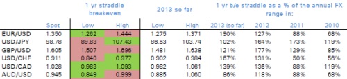 Indeed, the one-year straddle breakeven range is 127% of the full 2012 range, but well under 100% of the ranges that occurred during the height of the eurozone sovereign debt crisis in 2010 and 2011.