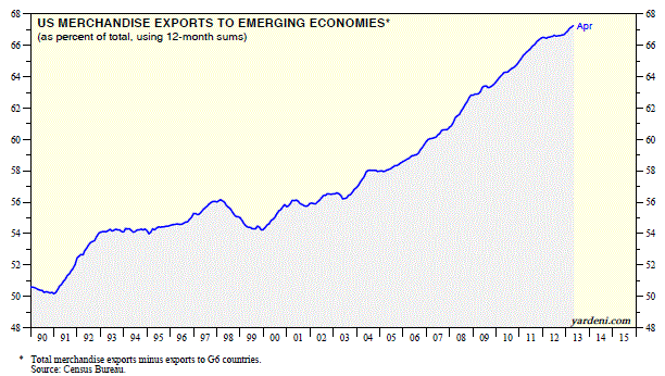 According to the research shop, total exports of goods and services account for 14% of US GDP. Of this, US merchandise exports to emerging economies account for 67% of total exports, up from about 50% in 1990.