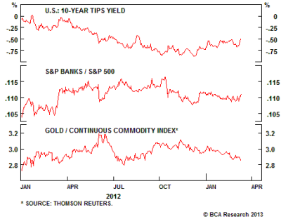 In turn, sub-par growth has kept the FOMC under pressure to continually look for ways to provide additional stimulus. Perceptions among policymakers and investors regarding the sustainability of the recovery will change when real GDP growth finally shifts to an above-trend pace. Three key market indicators will signal a shift in perception. First, gold prices should fall in absolute terms and relative to broad commodity indexes. Gold is a liquidity play and its relative performance is highly correlated with risk aversion.