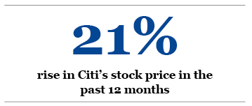 Over the 12-month period from March 20 2012, Citi’s stock price was up 21% compared with 8.9% at JPMorgan.