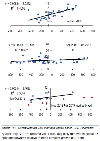 RBC, as can be seen in the chart below, compared FX turnover against average G10 one-month realized volatility.
