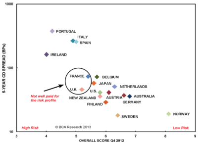 In a recent Special Report our Global Fixed Income Strategy service has updated its sovereign risk analysis. According to the results, fiscal constraints due to heavy debt loads in the US, Japan, and the UK are depressing their sovereign risk scores. Meanwhile, peripheral Europe is on the mend. Although the sovereign ranking methodology is not intended to predict spreads, the relationship between CDS spreads and our sovereign risk score highlights that the risk fundamentals in Spain, Italy, France and the UK are similar. However, investors are not well-compensated for the risks in the latter two countries.