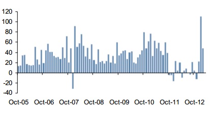 Gibbs says that could be causing a problem for the Chinese authorities, who for much of 2011 and 2012 might have thought they had reached a degree of equilibrium in the renminbi exchange rate that required little FX intervention.