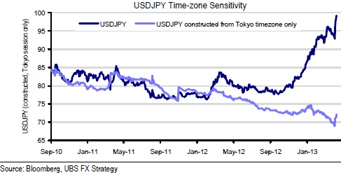 As the chart below from UBS shows, it has been outside of Tokyo hours that the lion’s share of yen selling has occurred. Although there has been a pick-up since last week’s policy decision from the BoJ, yen selling during Tokyo hours remains half-hearted.