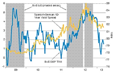 Hence, sterling gained support through that particular round of BoE QE, with trade-weighted sterling becoming closely correlated to eurozone bond yield spreads.