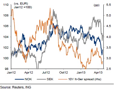 | SEK and NOK versus Italian-German 10-year yield spread |