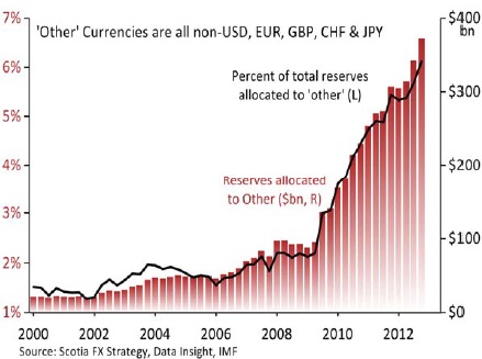 IMF data show that the share of allocated reserves in other currencies rose to a record 6.1% by the end of the fourth quarter of 2012, meaning that $54.8 billion-worth of reserves were added to that category last year.