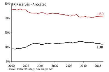 The share of allocated reserves denominated in the euro dropped to 23.9% at the end of 2012. That is down from 24.6% at the end of 2011, 26.0% at the end of 2010 and a peak of 28.4% in the third quarter of 2009.