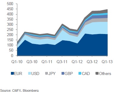 Figures released on Tuesday show that while the SNB marginally decreased the share of its euro and dollar holdings in the first quarter, it increased its holdings in other currencies (which include the Australian dollar, Swedish krona, Danish krone, Singapore dollar and Korean won), and perhaps more surprisingly its yen holdings.