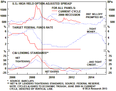 Corporate credit spreads narrowed throughout 2006 even after the Fed had boosted its target lending rate above equilibrium. Spreads continued to trend lower in early 2007 even after our Corporate Health Monitor moved into “Deteriorating Health” territory. While these two factors together created a formidable headwind for credit, spreads still needed a catalyst before reversing direction. That catalyst appeared in mid-2007 as the Senior Loan Officer survey revealed that banks were actively tightening lending standards. The supply of credit to low-quality firms was shut off and the market quickly handed high-yield investors a painful setback. High-yield bonds underperformed the Treasury market by nearly 2000 basis points between June 2007 and March 2008 as the index spread widened to 830 basis points.