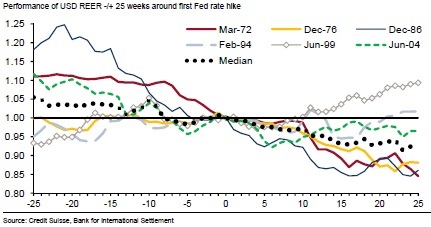 He points out even though sentiment towards the dollar is much more positive than many of its G7 peers, history suggests that rather than rising, the dollar generally falls during the initial phase of a Fed tightening cycle.