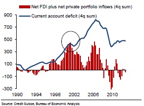 The most recent broad-based dollar rally began at the end of the 1990s and peaked in 2002. Then, the balance of payments situation was supportive of dollar strength, as the combination of FDI and private – not reserve manager – portfolio flows was enough to fund the current-account balance.