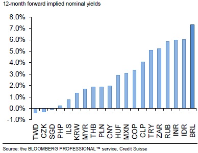 “While we acknowledge that US monetary policy expectations are likely to remain a powerful driver of price action, we also note that Brazil’s tightening bias stands out across all emerging markets,” says Credit Suisse.