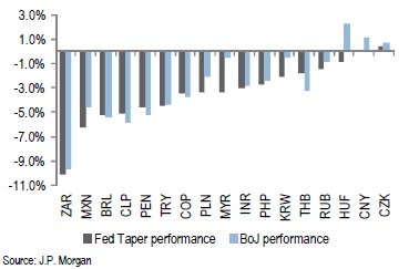 Still, as can be seen in the chart below, it has been the prospect of the Fed tapering its asset purchase programme, rather than developments in Japan, that has had the most bruising effect on EM currencies.