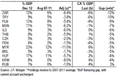 JPMorgan has added the balance-of-payments financing gap to the, admittedly extreme, scenario that foreign investors cut back their holdings of EM public sector debt to the average levels that prevailed between 2007 and 2011.