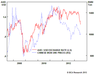 Australian shares ended their spectacular 10-year bull market relative to the global benchmark in 2008. They have since lagged the global average by about 25% over the past four years. The yield curve inverted and has remained flat as long-term interest rates have dropped, even though the RBA has been cutting short rates. One of the headwinds that explain why Australia’s economic and financial market fortunes have taken a turn for the worse is the weakness in commodity prices. Historically, Australia has always been a commodity play, but its dependence on commodity exports has increased massively since the beginning of the last decade. The share of commodity exports has risen from less than 45% of total exports in 1996 to more than 72% in 2011-12.