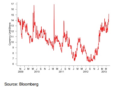 Second, although the yen has been the best-performing currency since the dollar peaked on May 22, rising nearly 8% from an intra-day high of ¥103.74, it is still down nearly 20% since November – just before Japanese prime minister Shinzo Abe returned to power with a promise to reflate the country’s economy and weaken its currency.