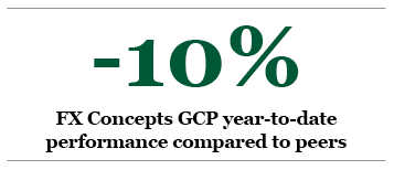 Although FX Concept’s GCP remains positive at around 3% since inception, year-to-date performance collapsed versus its peer group to -10%, says Savage.