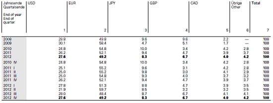 Furthermore, the proportion of SNB reserves denominated in the dollar, sterling, the Canadian dollar and other currencies, which includes the Australian dollar, remained stable, while the weighting of the euro increased, from 48% to 49%, and the share of the yen dropped from 9% to 8%.