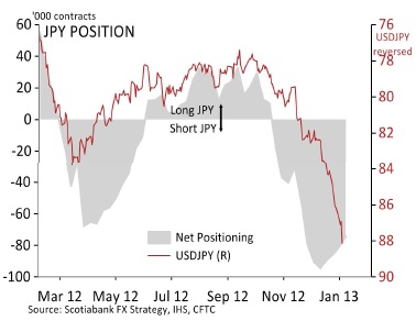 “The shorts need a good shake-out, because the various rationales for currency weakness in Japan are in danger of becoming stale and tired,” says Derks. “We can expect that the yen will be much more volatile than we were used to through 2011 and most of 2012.”