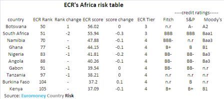 Analysts participating in the ECR survey downgraded South Africa’s ECR risk score by 0.3 points, to 55.9 points (out of a possible 100) in August, leaving Botswana in top spot in ECR’s Africa risk rankings.
