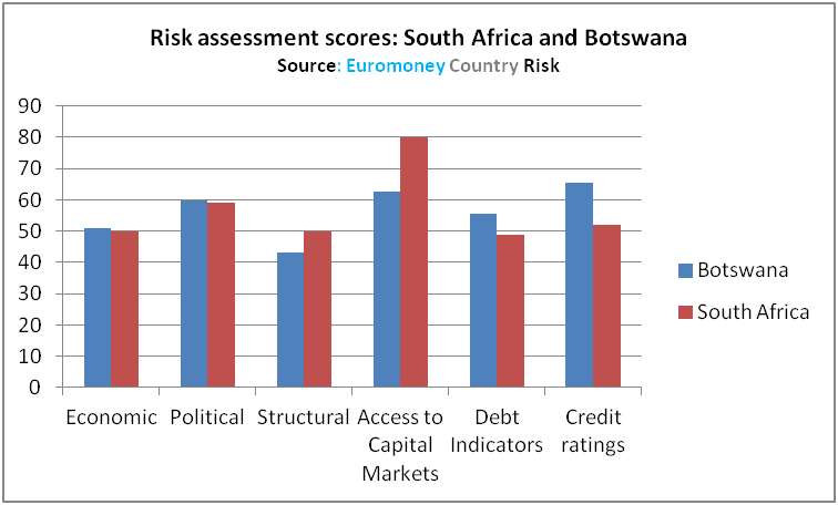 With a global rank of 51, South Africa now sits one place below Botswana in the survey. Botswana benefits from higher scores in the survey’s economic, political, debt and credit rating indicators than South Africa’s (see graph below).