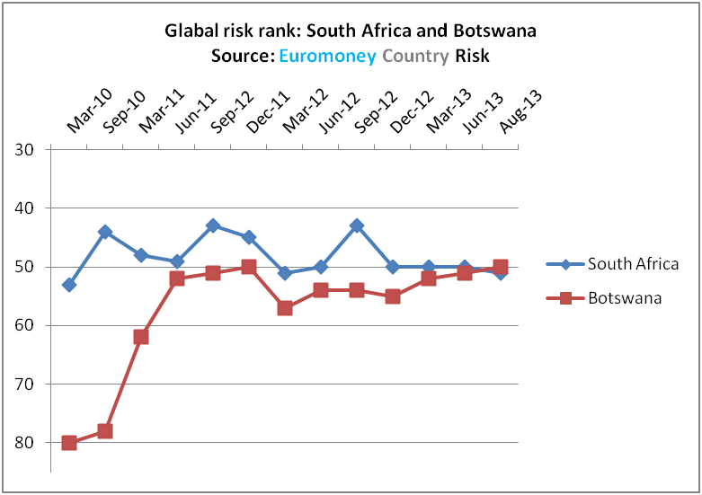 Botswana’s improving fundamentals have led it to climb 30 places since March 2010; South Africa has fallen three places over the same period.