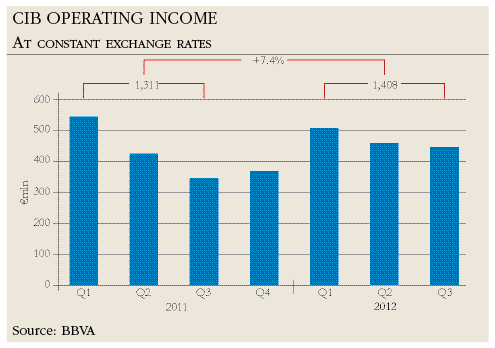 Between 2009 and the end of last year, BBVA hired around 1,000 new bankers into the wider CIB division across all products, industries and geographies. In the first nine months of 2012, operating income in the CIB division stood at €1.4 billion. That’s up 7.4% from the first nine months of 2011. On the basis of €5.55 billion equity allocated to the CIB division’s balance sheet, its €909 million net income for the first nine months implies a return of 16.4%.