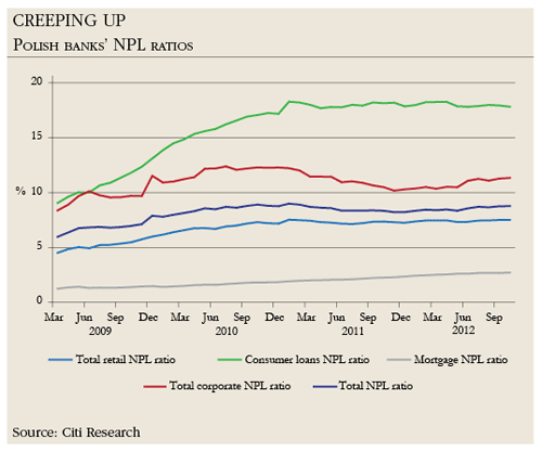 Bank provisioning costs rose by 17% year on year in the third quarter of 2012, in expectation of a rise in non-performing loans. By end-September, the ratio of bad loans to total lending stood at 8.8%, up from 8.2% at the start of the year. Analysts tip NPLs to rise above 9% in 2013.