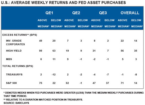 The above table shows the returns for various assets during the three episodes of quantitative easing to date. In almost every case, asset returns were greater in weeks when the Fed was buying more than the median amount of securities, and lower when it was buying less. These results suggest that some modest disruption in credit spreads is possible as the Fed embarks on tapering its asset purchase program. Reduced market liquidity could exacerbate volatility in the near run. Nevertheless, corporate fundamentals remain strong and accommodative monetary policy means that the search for yield will remain intact for another couple of years at least.