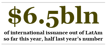 According to Dealogic, for the year to January 22 there was a total of $6.53 billion of international issuance out of Latin America (with 13 separate transactions) against a total of $11.98 billion for the same period last year (12 deals). So far this year, most of the international deal activity is coming out of Brazil, with five transactions valued at $2.78 billion. It is followed by Mexico, with one deal valued at $1.64 billion.