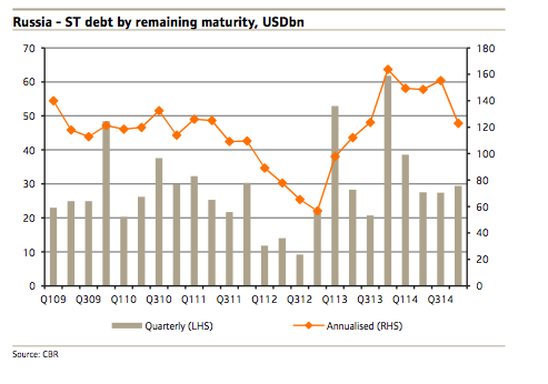 In any case, substantial tightening of external financing for Russian corporates is now expected. At the end of 2013, Russia had gross external debt liabilities of around $732 billion, with $155 billion due to mature in the third quarter of this year. Russian borrowers have increased their exposures in international markets in recent years.