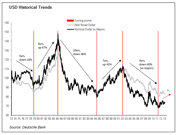 With US financial policymakers having linked stimulus to employment and inflation for the first time in December 2012, and the target for US overnight interest rates having been 0% to 0.25% since December 2008, the USD uptrend theory had instead been stuck in an environment where risk sentiment was not sufficiently buoyed by US growth to see inflows into US assets, but not sufficiently gloomy about an EM slowdown to see safe-haven inflows either, says Alan Ruskin, global head of G10 FX strategy at Deutsche Bank, in New York.