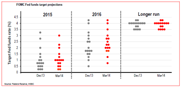 In practical terms, he adds, from an asset-market perspective, this would bring the first Fed rate hike into H1 2015 and possibly to late Q1, and this means that the market median forecast for rates at the end of 2015 had moved up to 1.00% from 0.75% in the December projections, and the median forecast for the end of 2016 had moved up to 2.25% from 1.75%.