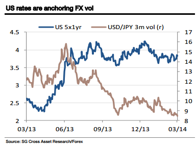 “The one-year US rate five-year forwards are a good way to gauge market expectations for FX and this has been in a 3.6% to 4.2% range since last autumn – a range consistent with the dollar moving sideways, FX vol falling and investors seeking out yield/carry,” he adds.