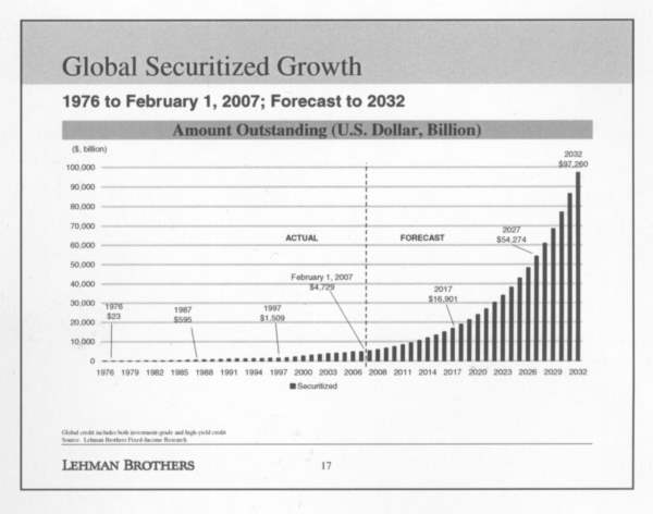 On page 17 the bank produced a chart confidently predicting the uninterrupted growth of global securitization from February 1 2007 to 2032. There was to be a smooth and steady increase in issuance from $4.7 trillion in 2007 to $16.9 trillion by 2017, $54.2 trillion by 2027 and an eye-popping $97.2 trillion by 2032.