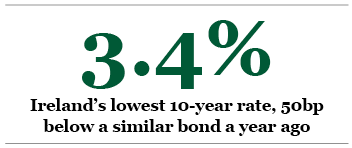 January’s bond sale resulted in Ireland funding itself for 10 years at 3.4%, some 50 basis points lower than a similar bond issued a year previously and 11 percentage points below the intraday trading high in the first week of 2011.