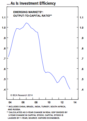 BCA Research, however, is bearish on EM assets. In particular, the shop is bearish on EM equities, citing the fact the return on capital for listed non-financial EM corporates has fallen to a 12-year low; continued weakness in China’s growth prospects; the fact that falling productivity performance has reduced listed corporate profitability; and that the correlation between EM equity returns and G7 GDP growth is negative.