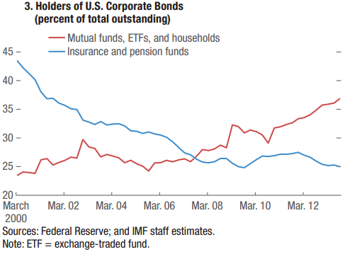 The IMF further points out that mutual funds and fixed-income ETFs also have a liquidity mismatch with the over-the-counter assets they reference, and that occasionally this liquidity mismatch creates a feedback loop that can exacerbate sell-offs, particularly when dealer inventories are too lean to act as a buffer.