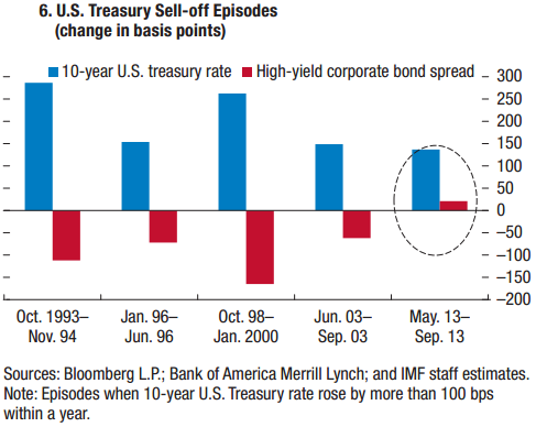 The concern is that if investors seek to withdraw massively from mutual funds and ETFs focused on relatively illiquid high-yield bonds or leveraged loans, the pressure could lead to fire sales in credit markets. The IMF shows that heavy outflows from corporate bond mutual funds and ETFs in May to June 2013 were accompanied by a rise in high-yield corporate bond spreads, in contrast with previous episodes when rising Treasury yields, implying improved credit conditions, were accompanied by lower credit spreads.