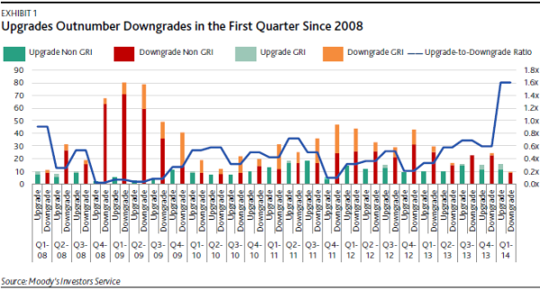 “There has been sustained negative pressure on EMEA non-financial corporates over recent years with negative actions consistently outweighing positive,” says Moody’s William Coley, group credit officer, EMEA corporates. “Against this backdrop, Q1 2014 is therefore remarkable in being the first quarter since 2008 to show more upgrades than downgrades.