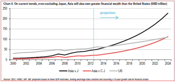 China’s household wealth at $28 trillion versus $32 trillion in Japan has buoyed the region ex-Japan, which will overtake the US’s $62 trillion market in 2015. Asia as a whole overtook the US in 2007.
