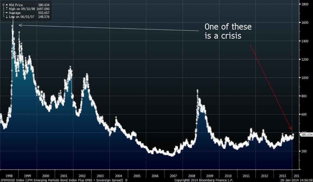 Finally, to put the plunge in context: as this chart lays bare, EM hard-currency fixed income, in particular, is nowhere near 1998 crisis-era levels, while EM’s stronger macro fundamentals is well-known – two factors that have exasperated some analysts who decry apparently alarmist media coverage on the EM rout.